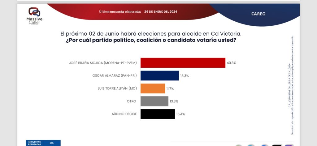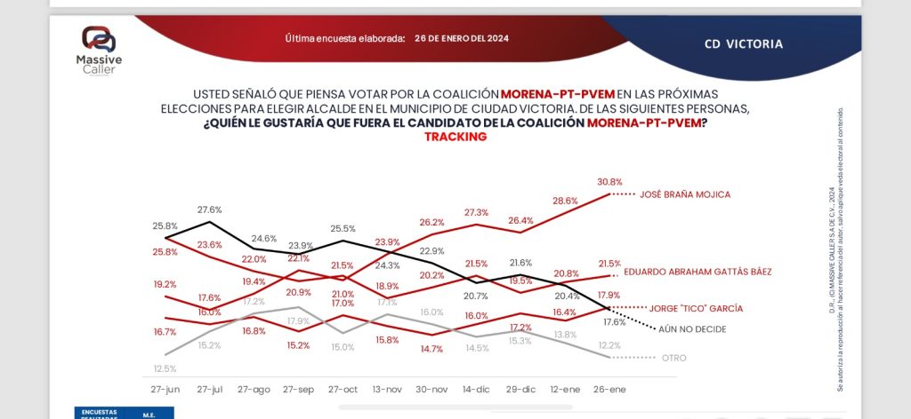 Massive Caller, ha publicado los resultados de 11 encuestas realizadas en esta capital entre 27 de junio del 2023 y el 25 de enero del 2024 con el fin de saber las preferencias de los morenistas victorenses previo a la próxima contienda por la Alcaldía de Victoria.