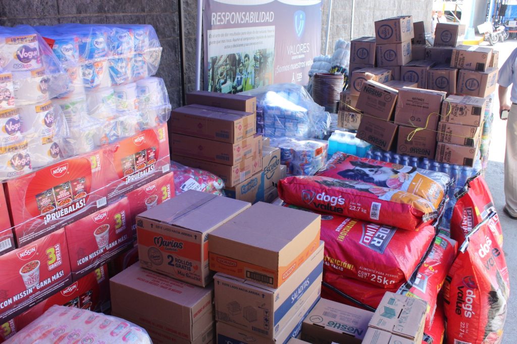 El donativo consiste en productos alimenticios enlatados como atún y verduras, granos como arroz y frijol, azúcar, leche, sopa instantánea e incluso alimento para mascotas. Además de productos de limpieza personal y para el hogar como blanqueador, crema dental, detergente, jabón, papel higiénico, shampoo, toallas para bebé, toallas femeninas.