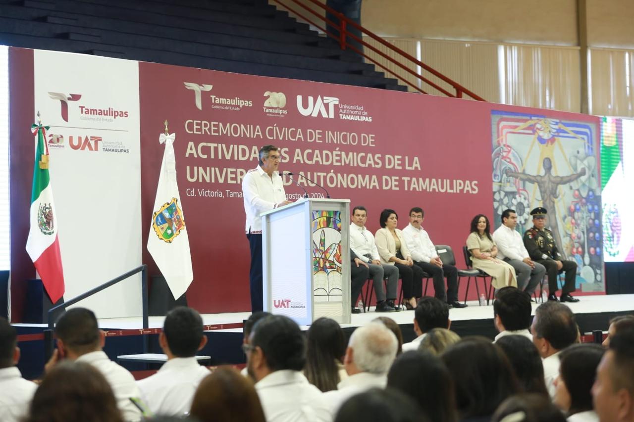Al asistir a la ceremonia cívica de inicio de actividades académicas de la UAT, junto al rector Dámaso Anaya Alvarado, el gobernador refrendó todo su apoyo a la Máxima Casa de Estudios para lograr mayores oportunidades de desarrollo.