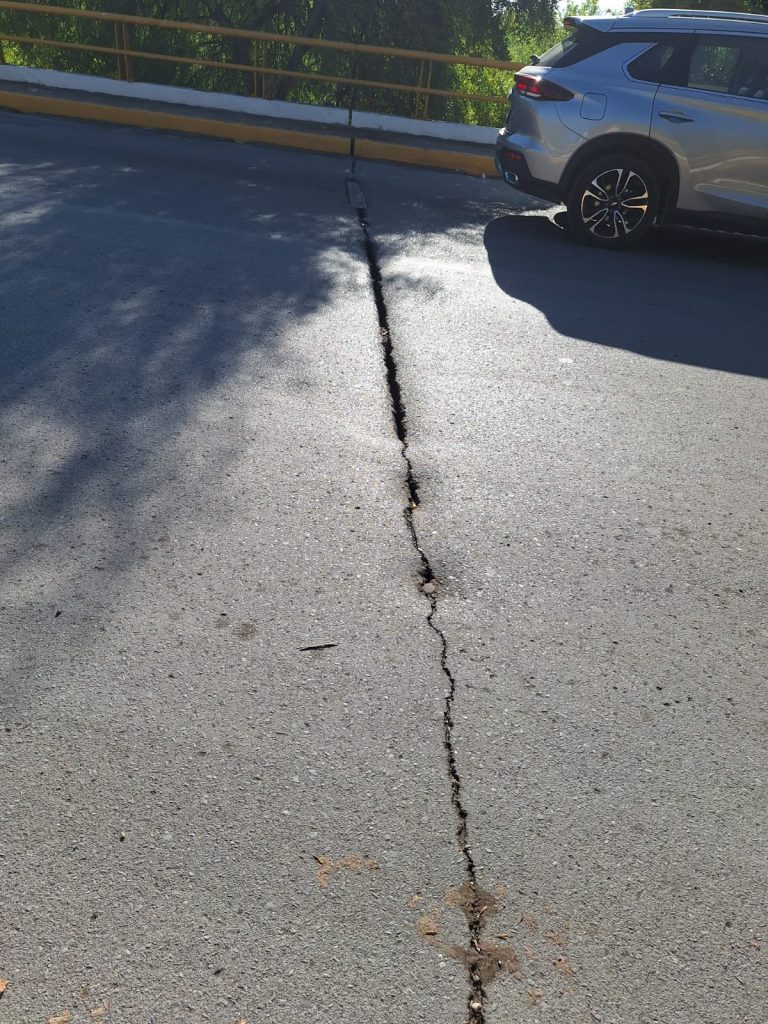Eusebio Alfaro Reyna, titular de la dependencia, encabezó la supervisión junto a elementos de la Coordinación de Protección Civil para determinar el daño que presenta la construcción de concreto por el continuo tráfico vehicular y exceso de humedad derivada de las recientes lluvias.