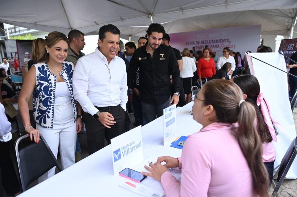 El presiente municipal de Victoria Eduardo Gattás Báez y Sra. Lucy de Gattás, acompañados del Secretario del Trabajo y Previsión Social de Tamaulipas Gerardo Illoldi Reyes, cortaron el listón inaugural de la feria de reclutamiento que garantiza a las mujeres victorenses empleos dignos con buenas prestaciones y salarios.
