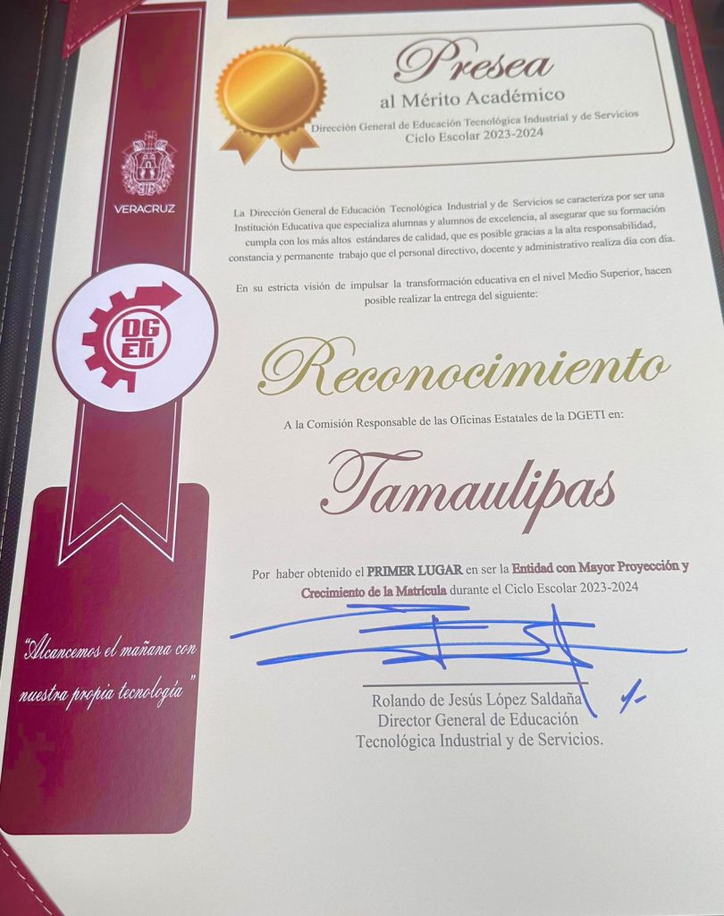 Los reconocimientos fueron entregados personalmente por el Director General de Educación Tecnológica Industrial y de Servicios en el país (DGETI), Dr. Rolando de Jesús López Saldaña, en el marco de la “SEGUNDA REUNIÓN NACIONAL DE COMISIONADOS RESPONSABLES ESTATALES DE LA DGETI 2024”, y donde Tamaulipas sobresalió en Preseas al Mérito Académico.