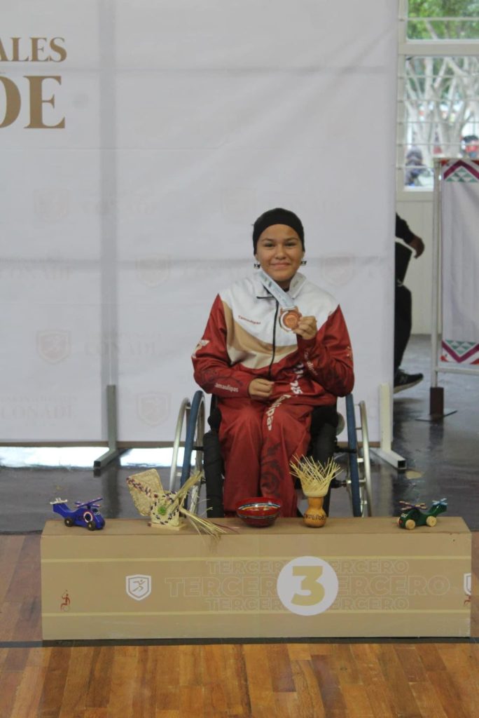 En cuanto a las medallas de bronce, Clara Guadalupe Olivares Martínez, participando en la categoría femenil 10-22 años, clasificación TT1 a TT5, subió al podio tras una destacada actuación.