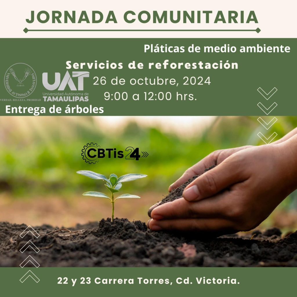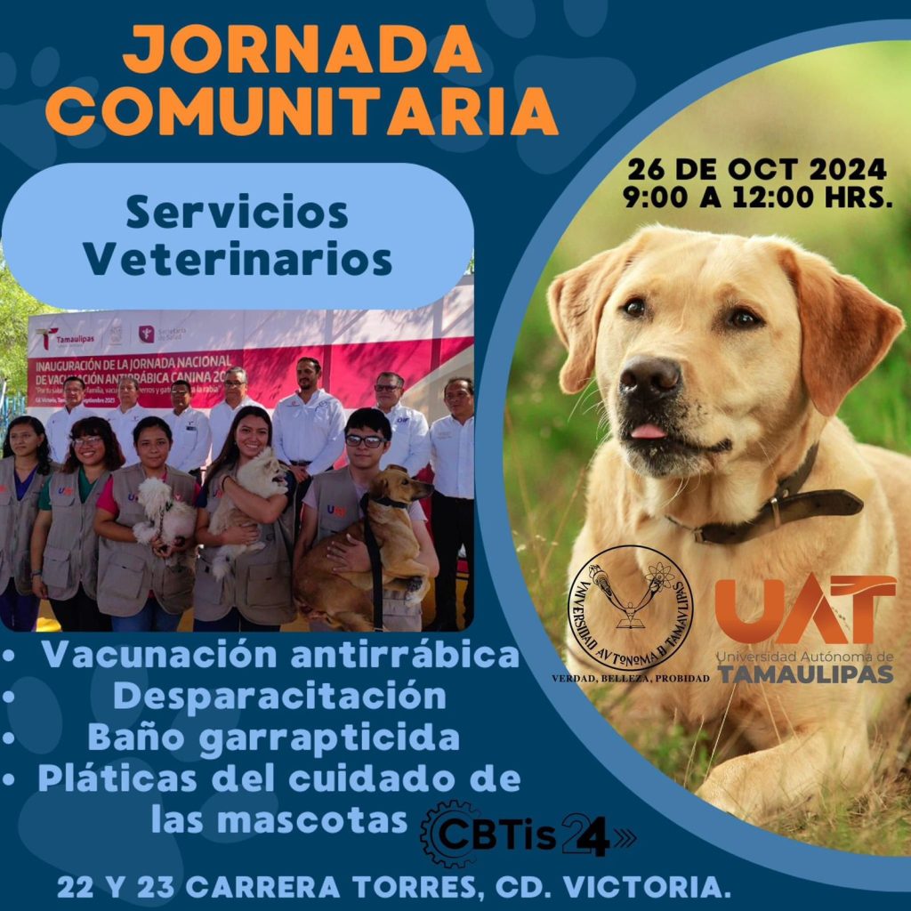 El CBTis 24 y La Universidad Autónoma de Tamaulipas ofrecieron a las familias del CBTis 24 y al público en general la Jornada Comunitaria gratuita de servicios salud e higiene humana y veterinaria, asesoría legal, oferta educativa, reforestación y actividades recreativas, que se llevarán a cabo el sábado 26 de octubre, de 9:00 a 12:00 hrs. en las instalaciones del plantel 22 y 23 Carrera Torres en Cd. Victoria.