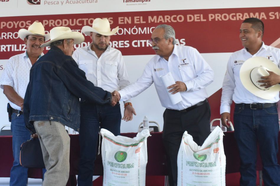 Padilla, Tamaulipas. – En apoyo a los citricultores del sector social de Tamaulipas, el gobernador Américo Villarreal Anaya, a través de la Secretaría de Desarrollo Rural, Pesca y Acuacultura dispuso la entrega de 280 toneladas de fertilizante granulado sulfato de amonio como parte del programa 107 Apoyo al Desarrollo Productivo y Económico, en donde se destinó un presupuesto de 15 millones de pesos.