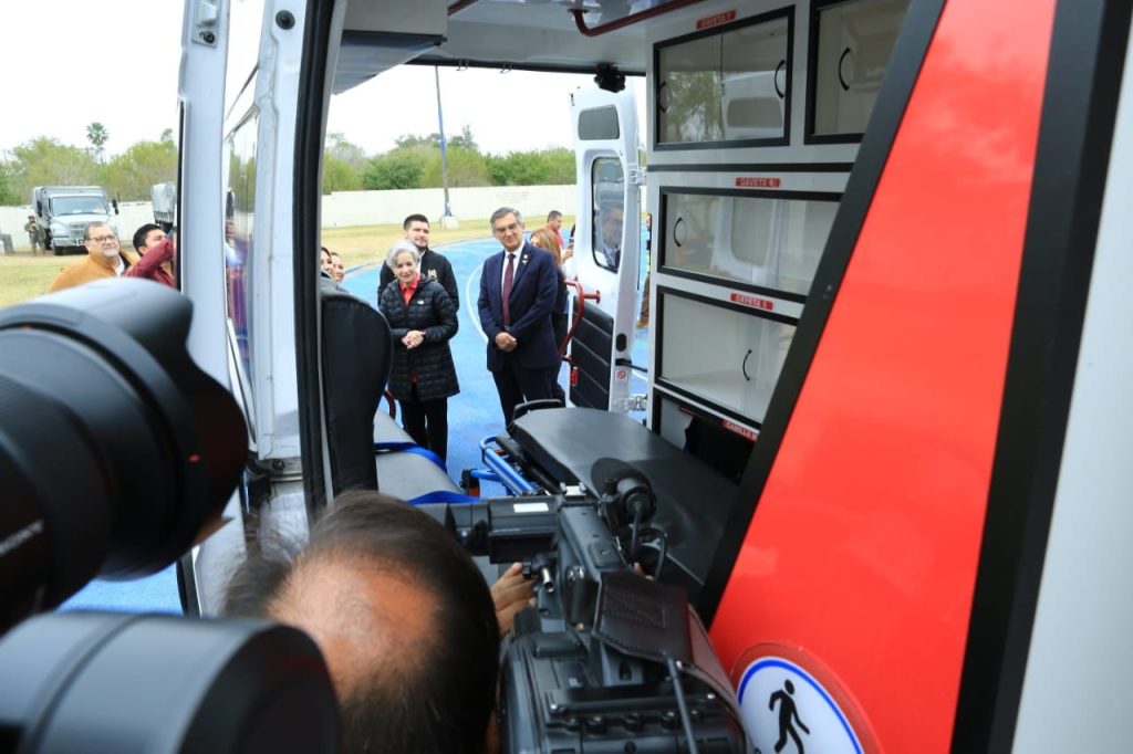 Matamoros, Tamaulipas.- El gobernador Américo Villarreal Anaya visitó el Centro de Atención para Repatriados y, junto con la presidenta del DIF Estatal, doctora María de Villarreal, entregó una ambulancia que estará disponible para atender a la población migrante.