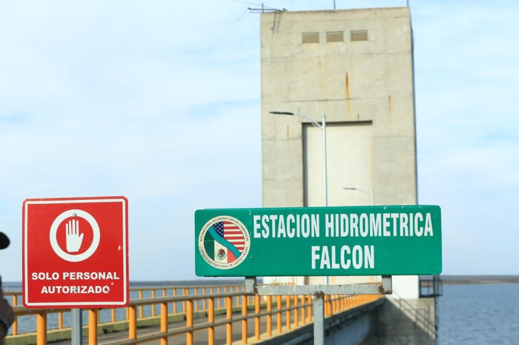 Como parte de su gira de trabajo en la zona ribereña, el gobernador, acompañado por la presidenta del DIF Estatal, doctora María de Villarreal, llegó hasta la estación hidrométrica Falcón, en los límites entre Tamaulipas y Texas, donde constató la crítica situación por los bajos niveles de esta presa internacional.
