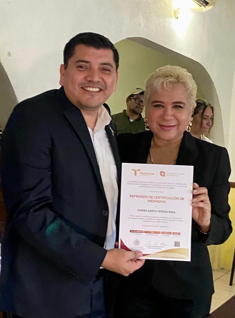 Asimismo, se hizo un reconocimiento a Yadira Judith Cepeda Sosa, presidenta de la Barra de Abogadas del Estado de Tamaulipas, por su liderazgo y dedicación en la formación de mediadoras certificadas. “Su esfuerzo ha sido esencial para impulsar una cultura de paz en la comunidad jurídica, permitiendo a las mujeres abogadas desempeñar un papel crucial en la resolución pacífica de conflictos”, expresó el director de Mediación.