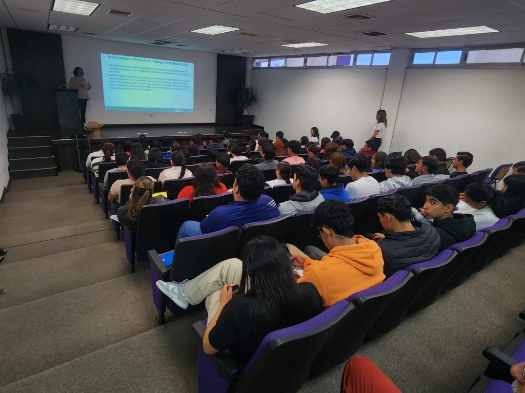 La conferencia “Homeostasis: Manual para tu tranquilidad financiera” fue impartida por María Teresa Borja Chico, gerente de Educación Financiera de BANXICO, ante estudiantes del séptimo y octavo cuatrimestre de la Licenciatura en Administración y Gestión Empresarial. Durante la sesión, se abordaron estrategias y conocimientos clave para lograr la tranquilidad financiera y mejorar el bienestar económico.