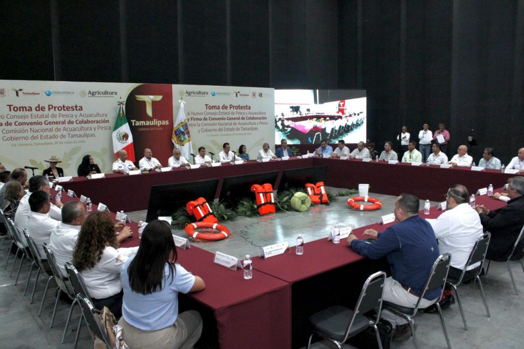 Ciudad Victoria, Tamaulipas.- Con el objetivo de promover la coordinación y colaboración entre los tres niveles de gobierno, así como con los organismos productivos del sector social y privado, se realizó la instalación del Consejo Estatal de Pesca y Acuacultura, acompañada de la firma del Convenio General de Colaboración entre la Comisión Nacional de Acuacultura y Pesca y el Gobierno de Tamaulipas.