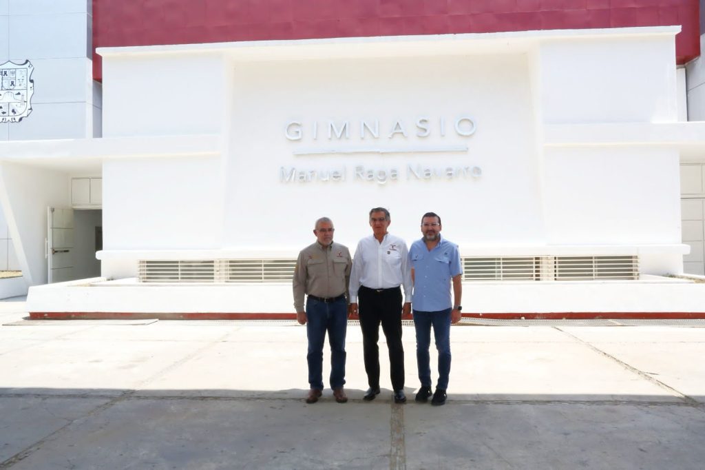 Villarreal Anaya también constató la rehabilitación del gimnasio Manuel Raga Navarro, donde se llevan a cabo acciones diversas como la colocación de duela de maple en cancha de basquetbol profesional, rehabilitación de puertas metálicas y de aluminio, cambio de luminarias, instalación de un sistema de ventilación y extracción de aire, así como aplicación de sistema aislante térmico en la cubierta de lámina en el exterior. Estos trabajos suman un monto de 6 millones 62 mil 764 pesos y tienen un 93 por ciento de avance.
