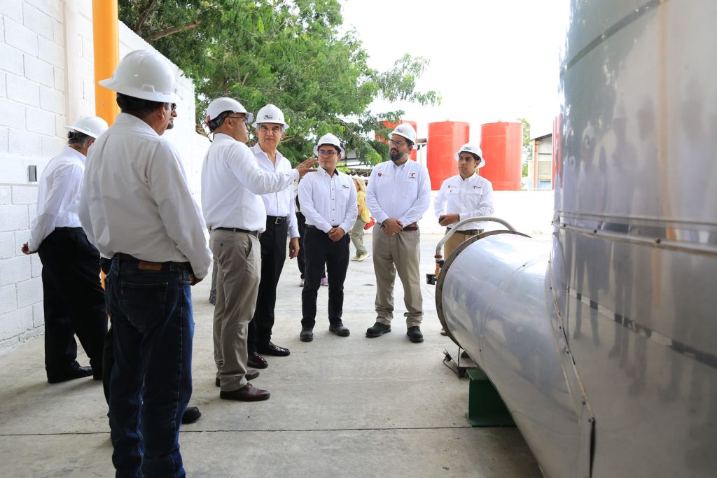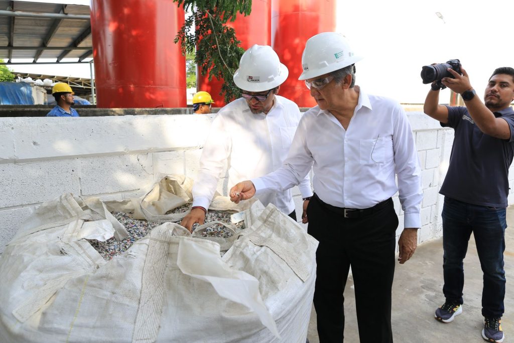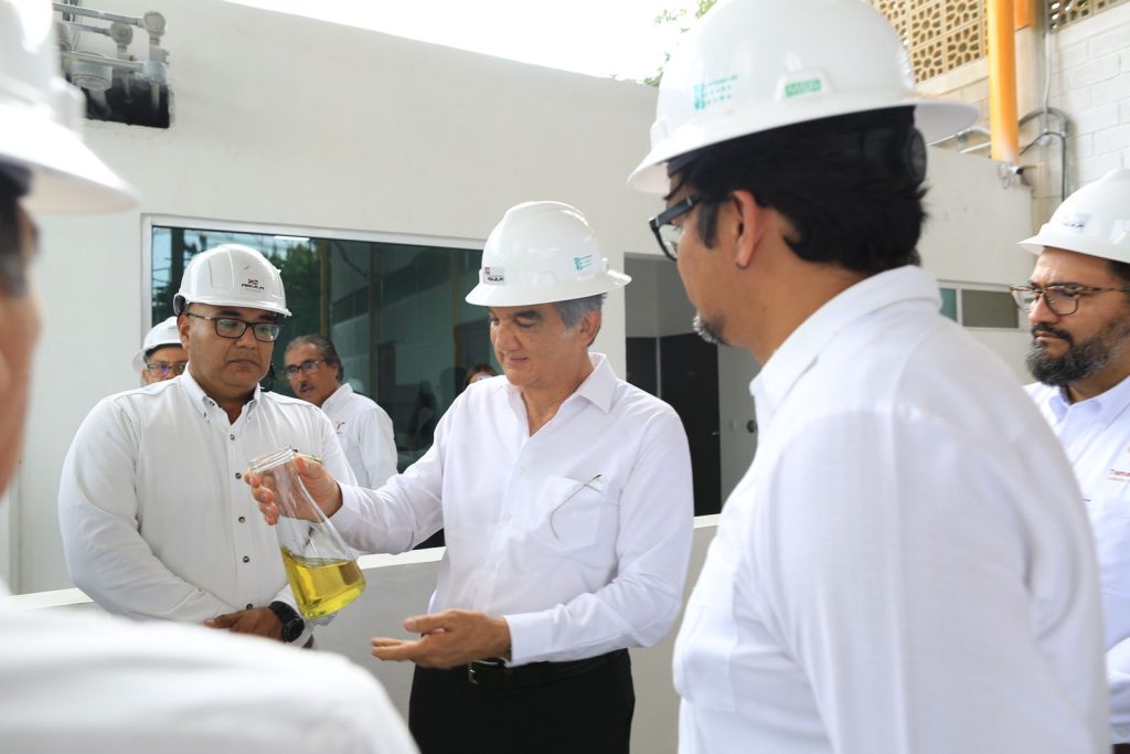 Altamira, Tamaulipas.- El gobernador Américo Villarreal Anaya efectuó un recorrido por las instalaciones de la planta de la empresa Green Bauen, filial del Grupo Industrial Águila, en la cual se procesan desechos plásticos permitiendo la generación de queroseno, parafinas, gasolina y diesel, utilizando tecnología cien por ciento tamaulipeca.