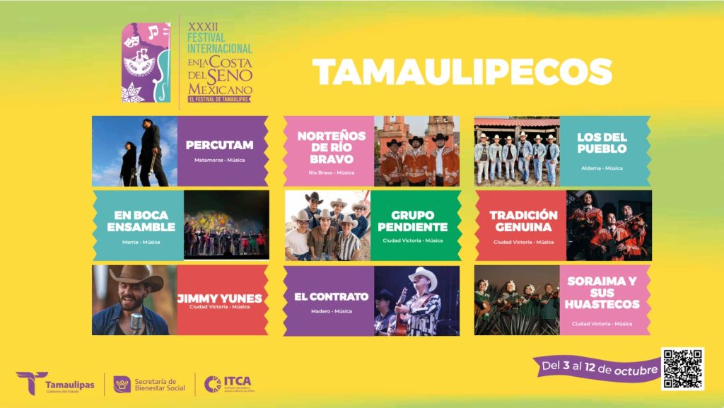 Ciudad Victoria, Tamaulipas.– El Festival Internacional en la Costa del Seno Mexicano, en su 32ª edición, llegará a los 43 municipios del estado con eventos gratuitos que se extenderán a las comunidades más apartadas, para el disfrute de todas y todos los tamaulipecos, gracias al impulso del gobernador Américo Villarreal Anaya a los programas y acciones generadoras de bienestar.