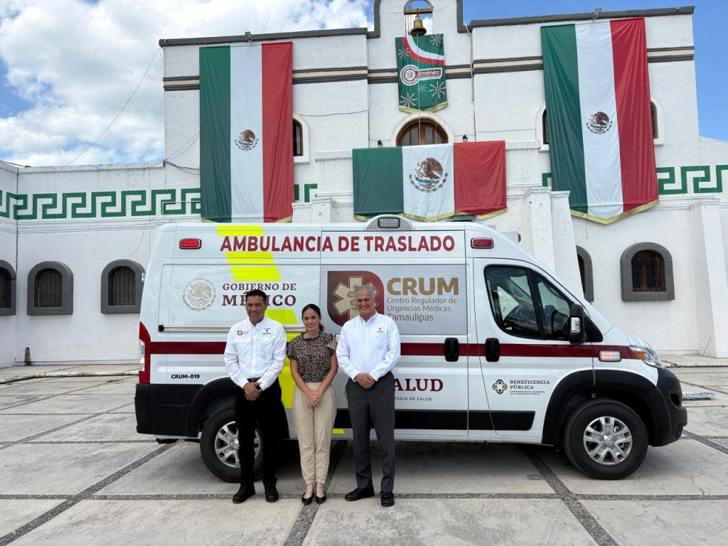 Acompañado por las alcaldesas de Jiménez, Corina Garza Arreola; de Soto la Marina, Glynnis Jiménez Vázquez; y de Aldama, María Noemí Sosa Villarreal; así como del titular del Centro Regulador de Urgencias Médicas (CRUM), Carlos González Castro, el secretario de Salud visitó los municipios de Jiménez y Soto la Marina para realizar la entrega de manera personal y fue en el estacionamiento de la dependencia estatal que se efectuó el traspaso de la unidad a la presidenta municipal de Aldama.