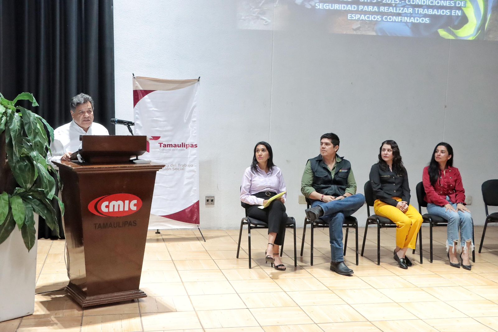 Al evento asistieron autoridades estatales y representantes del sector empresarial, entre ellos, Carolina Iveth Martínez Molano, subsecretaria del Empleo y Productividad Laboral.; Consuelo Nayeli Lara Monroy, directora general de Inspección y Previsión Social y Ricardo Ruiz Soria, en representación de la CMIC Tamaulipas, además de representantes federales y municipales vinculados al impulso de la seguridad laboral.