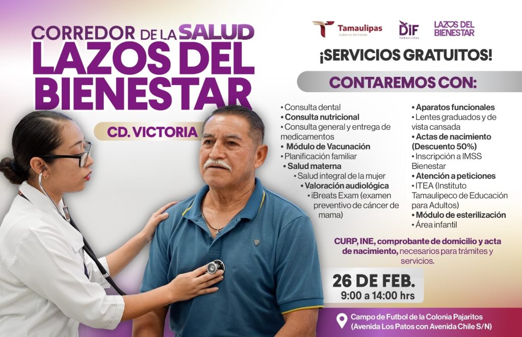 Ciudad Victoria, Tamaulipas.- El Sistema DIF Tamaulipas, que preside la doctora María de Villarreal, en coordinación con el Gobierno del Estado y el IMSS Bienestar, invita a las familias a participar en los Corredores de la Salud “Lazos del Bienestar”, una estrategia que acerca servicios gratuitos de salud, prevención, orientación y trámites.