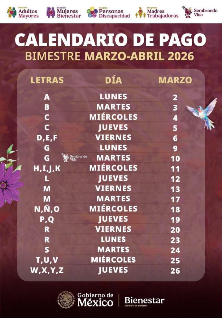 La Secretaría de Bienestar Federal, a través de Ariadna Montiel Reyes, informa que ha iniciado la dispersión de recursos correspondientes al segundo bimestre marzo–abril 2026 de los Programas para el Bienestar.