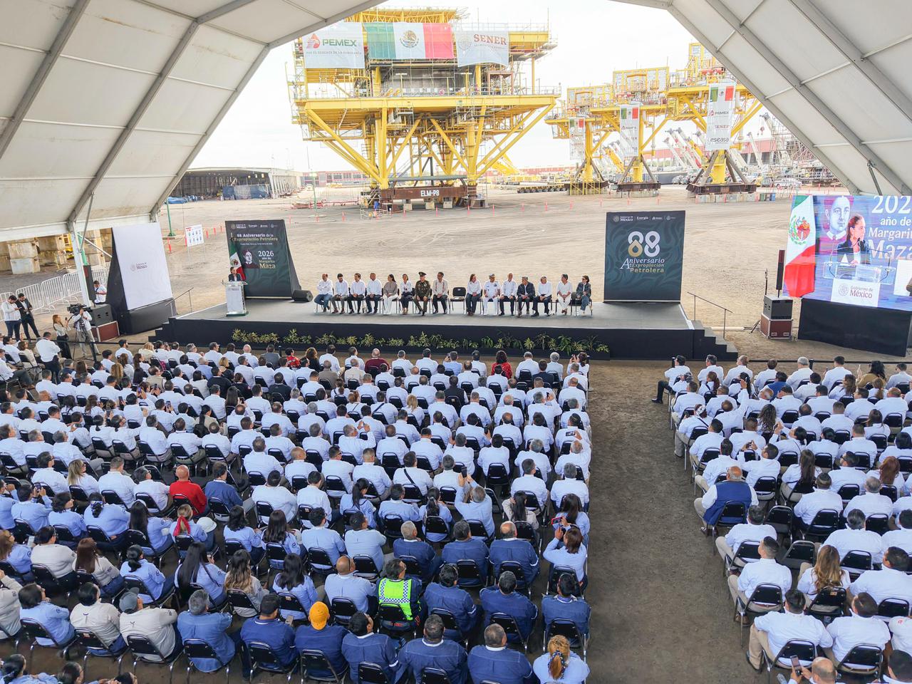 Pueblo Viejo, Veracruz, a 18 de marzo de 2026.- En el 88 Aniversario de la Expropiación Petrolera, la Presidenta Claudia Sheinbaum Pardo reafirmó su compromiso con el futuro energético de la nación y anunció que su gobierno continuará el fortalecimiento de Petróleos Mexicanos (Pemex) y de la Comisión Federal de Electricidad (CFE) como empresas del pueblo de México, por lo que el llamado para avanzar en la soberanía energética es aumentar la producción de gas natural y de fuentes renovables, así como mantener la producción y el procesamiento de petróleo.