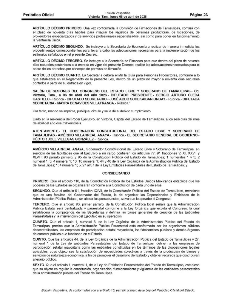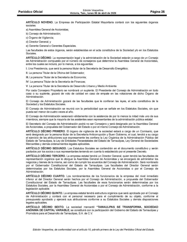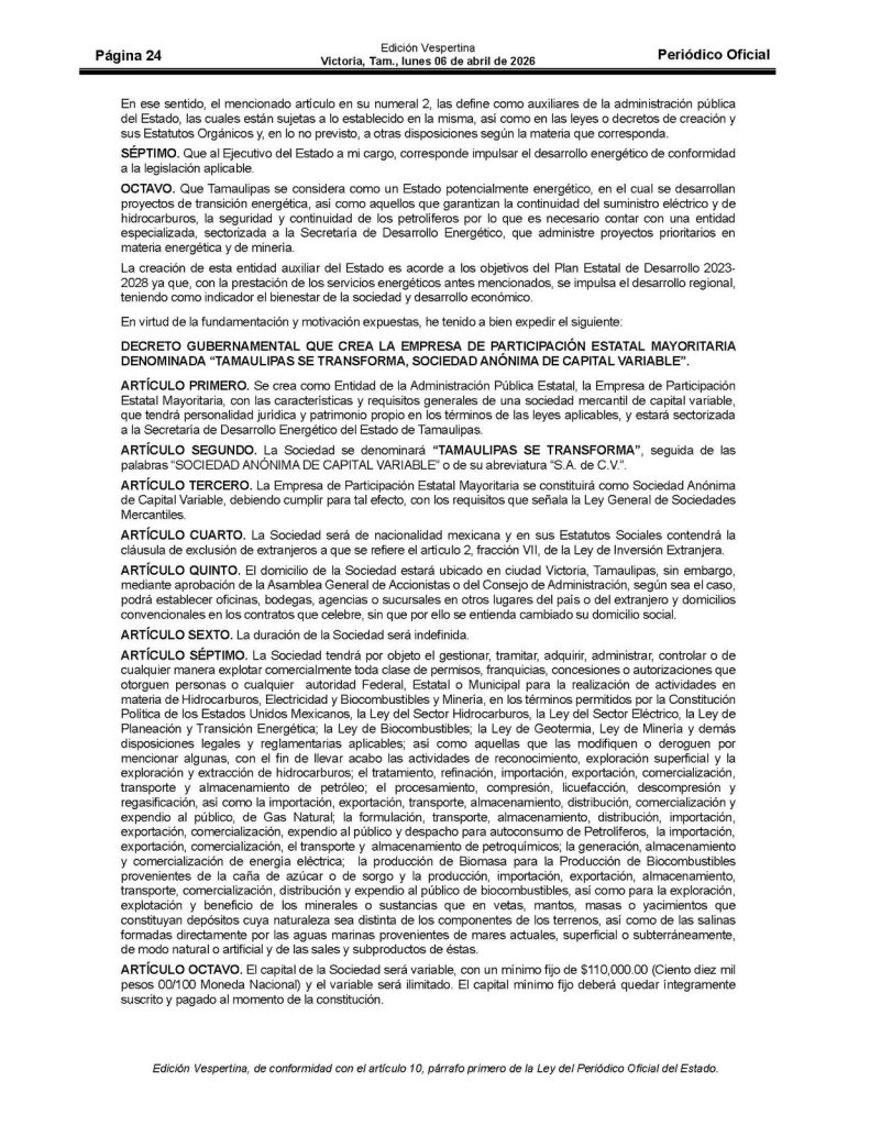 Ciudad Victoria, Tamaulipas.- El lunes 06 de abril fue publicado en la versión vespertina del Periódico Oficial del Gobierno del Estado de Tamaulipas, el decreto gubernamental para la creación de la empresa de participación estatal mayoritaria denominada “Tamaulipas se transforma, S.A. de C.V.”, que trabajará como un brazo aliado de la Secretaría de Desarrollo Energético del estado.