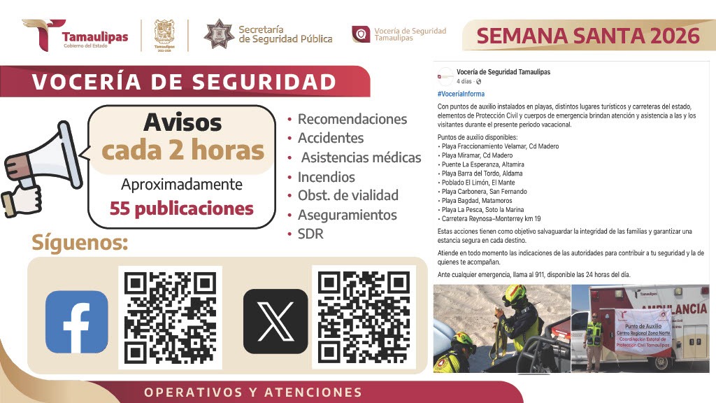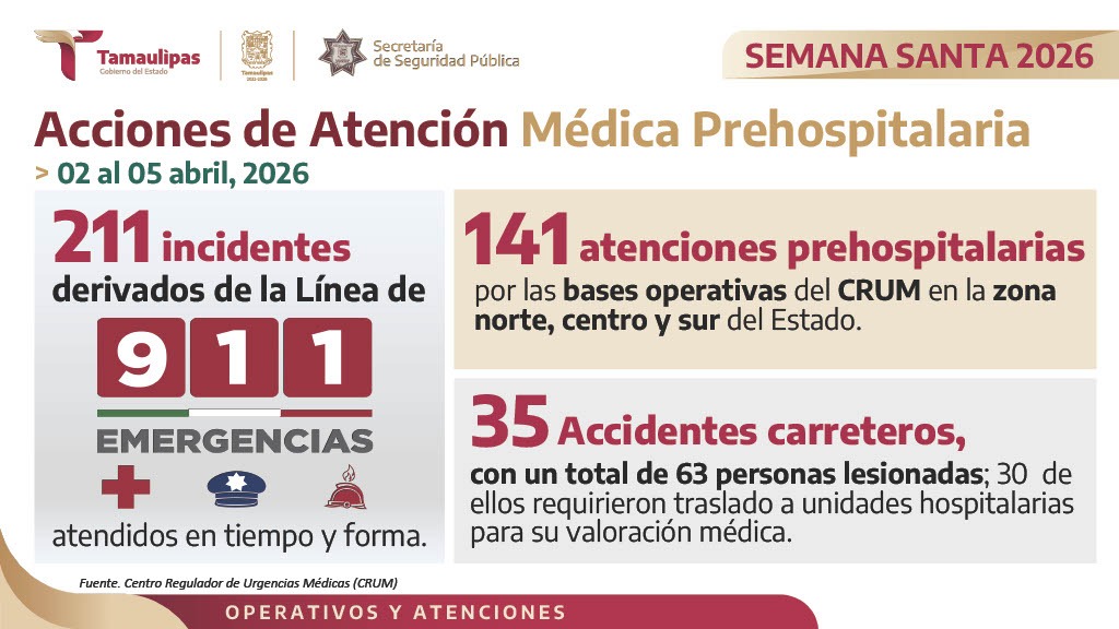 Por su parte, Willy Zúñiga Castillo, titular del Secretariado Ejecutivo del Sistema Estatal de Seguridad Pública, expresó que elementos de Protección Civil atendieron 28 accidentes viales en carretera y 64 servicios de atención prehospitalaria, además de cinco rescates acuáticos, en tanto que el Centro Regulador de Urgencias Médicas proporcionó 141 atenciones prehospitalarias y atendió 35 accidentes carreteros, con un total de 63 personas lesionadas, 30 de los cuales requirieron traslado a unidades hospitalarias para su valoración médica.
