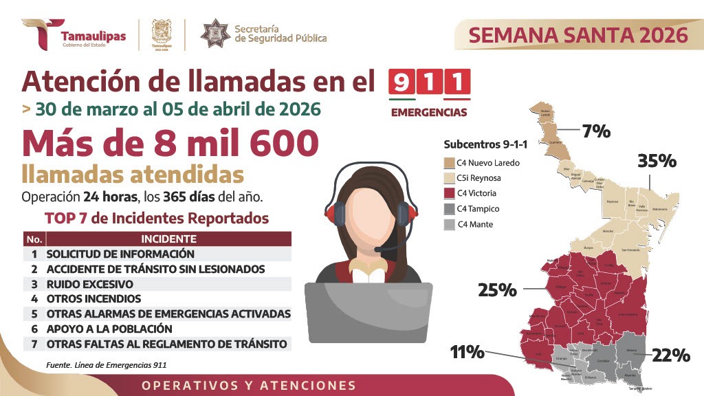 Agregó que a través de la línea 911 se atendieron más de 8 mil 600 llamadas, entre las cuales destacaron la solicitud de información y el reporte de tránsito sin lesionados, concentrándose el 35% en el C5 de Reynosa y un 25% en el C4 de Ciudad Victoria.