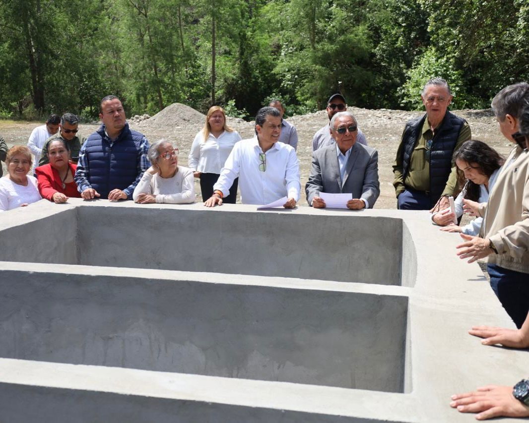 En compañía del gerente de la Comisión Municipal de Agua Potable y Alcantarillado (COMAPA), Fernando García Fuentes, y el secretario de Obras Públicas del Municipio, Eusebio Alfaro Reyna, recorrió la cimentación de la obra hídrica que beneficiará a 146,314 ciudadanos.